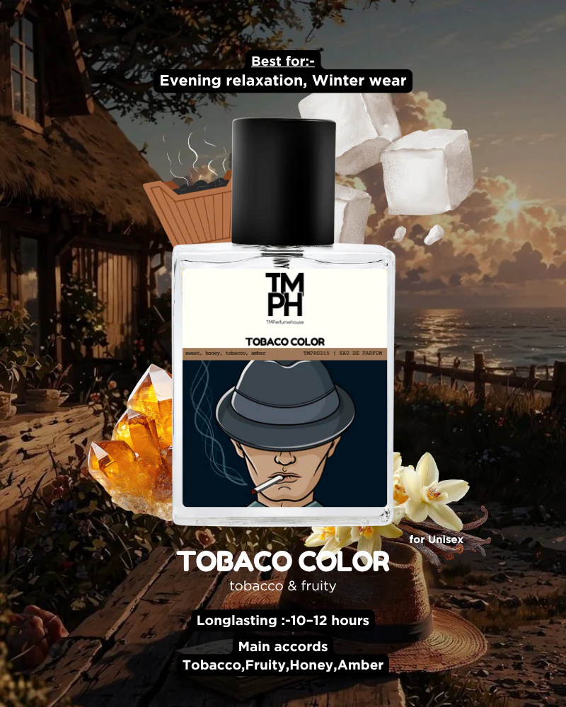 Tobacco Color Perfume by TMPerfumehouse is a luxurious fragrance celebrating the richness of tobacco leaves. First, it opens with sweet plum and honey. This creates a warm and inviting introduction. Next, the heart blends smoky tobacco, resins, and spicy undertones, adding depth and sophistication. Then, amber, woods, and tonka bean form a rich, long-lasting base. Therefore, Tobacco Color Perfume leaves a powerful, elegant, and unforgettable trail. It is perfect for evening wear and special occasions.